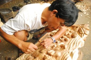 I find a very old Filipino craftsman and watch him carve with a small, sharp knife.