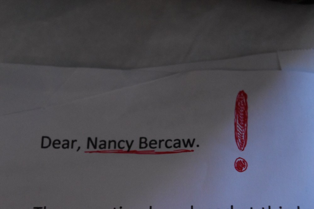 Then, we headed back to our hotel-apartment where the receipt for our stay had been slipped under our door with the salutation “Dear, Nancy Bercaw” and a ridiculously huge exclamation point.